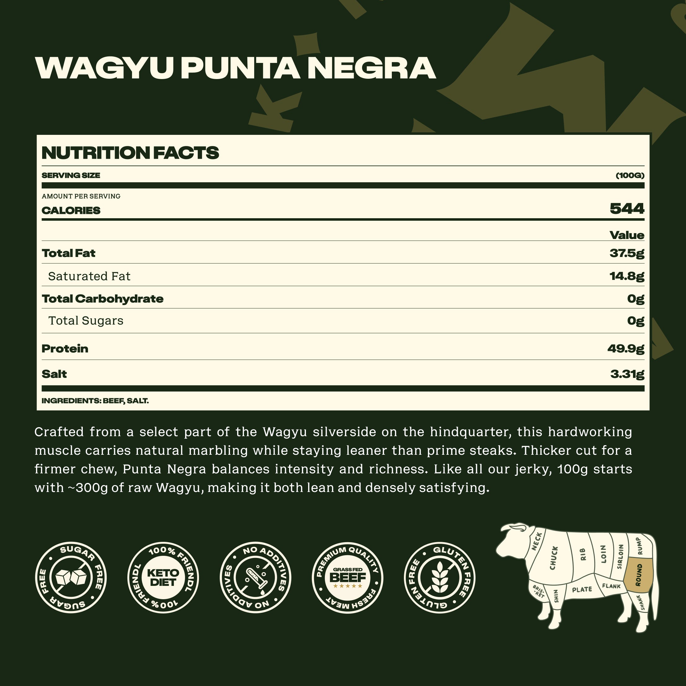 Cut slightly thicker to enhance its texture, Wagyu Punta Negra melts on the palate, releasing a rich, lingering caramelised flavour with every bite. Its balanced umami depth and luxurious mouthfeel make it a truly distinctive beef snack.